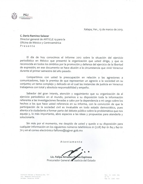 General de Justicia del Estado, respaldo a la organización ARTICLE 19, que