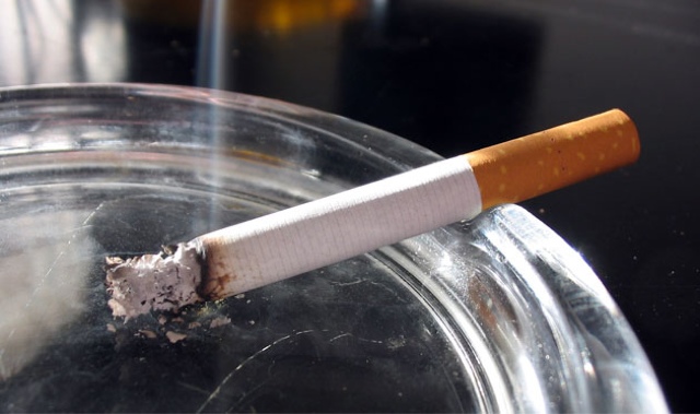 Una persona tira ceniza junto a otras colillas de cigarrillo.