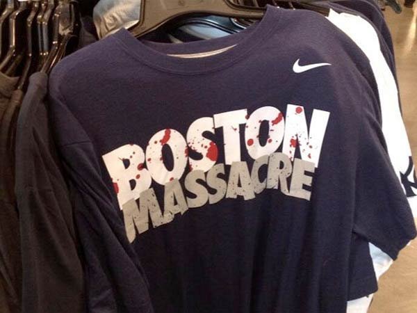 Ciertamente, podemos debatir la conveniencia (o dudosa inteligencia) de una camiseta que dice «Masacre de Boston» – la referencia histórica es un incidente en el que 1770 soldados británicos mataron a cinco civiles e hirió a otros seis, pero ahora al parecer se refiere a las victorias de los Yankees sobre los Medias Rojas, o algo parecido. Parece que la ecuación tragedia + tiempo = eslogan pegadizo en camiseta. Pero lo que está claro es que a raíz de acontecimientos trágicos del Maratón de Boston de la semana pasada, estas camisas ahora traen a la mente los bombardeos de una manera que Nike ciertamente nunca tuvo la intención.
