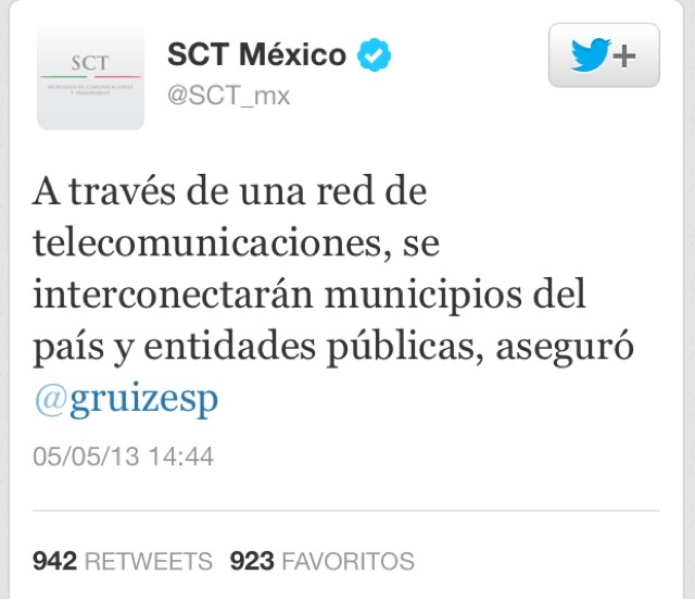 La Secretaría de Comunicaciones y Transportes, por medio de su cuenta de Twitter anunció que: “A través de una red de telecomunicaciones, se interconectarán municipios del país y entidades públicas, aseguró @gruizesp”.