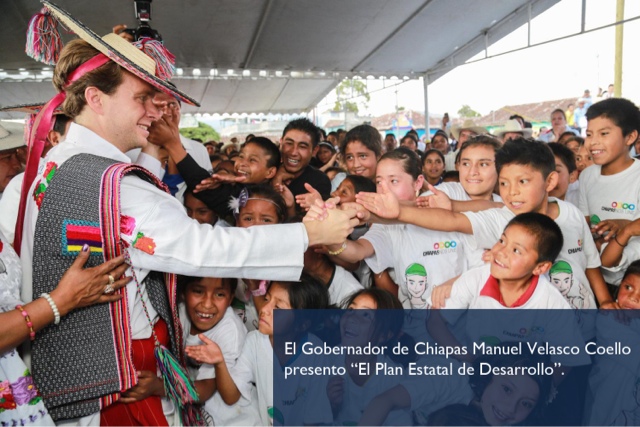 Manuel Velasco Coello actual Gobernador del estado de Chiapas y único militante del partido Verde Ecologista en ganar una elección de Gobernador presenta el día de hoy el Plan Estatal de Desarrollo. Con una amplia carrera política el Gobernador reitera su compromiso con el pueblo chiapaneco para mejorar la calidad de vida y proteger la sustentabilidad de las tierras. El eje central del Plan Estatal de Desarrollo se centra en una inversión de las de 29 millones de pesos en educación, 8,500 apoyos para el equipamiento del campo y un nuevo programa el cual se enfocará en mejorar los servicios médicos para todos los chiapanecos. Manuel Velazco propone un gobierno verde, proponiendo un estado sustentable y enfocado a generar un campo productivo y rentable que ayude a miles de familias chiapanecas. Algo de su historia: En 2006 tras realizar una intensa campaña recorriendo los 123 municipios del Estado de Chiapas gana la senaduría, este fue el paso que le ayudó a ser reconocido como el senador mas joven de toda la historia. Así mismo se repitió la historia cuando el 1º de Julio del 2012 se declara electo como Gobernador del estado de Chiapas. Una de las medidas que implementó una vez electo fue reducirse el salario en un 50%, acción que provocó aplausos del pueblo chiapaneco.