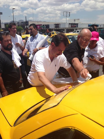 Saltillo, Coahuila, 9 de junio de 2013DAN TAXISTAS DE LA CROC RESPALDO A FERNANDO DE LAS FUENTES Encabeza candidato del PRI pega de calcas; propone Consejo Municipal del Taxi Alrededor de mil 500 taxistas adheridos a la CROC manifestaron su respaldo a la candidatura del abanderado priísta, Fernando de las Fuentes Hernández, quien encabezó en el bulevar Francisco Coss una actividad de pega de calcas. Los taxistas comenzaron a llegar a la Plaza de las Ciudades Hermanas para que les colocaran calcas del candidato y apoyarlo. De las Fuentes dijo a los asistentes que su administración será aliada de los taxistas pues las condiciones laborales del gremio deben ser mejoradas. Les informó que su plataforma de campaña contempla una propuesta para crear el Consejo Municipal del Taxi enfocado a mejorar el servicio. “Y es que luego algunos creen que el transporte público sólo son los camiones y no, nuestros amigos taxistas representan una parte medular en la movilidad social a la que es necesario atender”, señaló De las Fuentes Hernández. Comentó que ese Consejo Municipal del Taxi donde participen ciudadanos verá la viabilidad de implementar los taxímetros, todo en pro de un mejor servicio a la ciudadanía. La propuesta es un acierto… Los taxistas que asistieron pertenecen a 55 centrales, informó Mario Enrique Morales Rodríguez, dirigente estatal de la CROC. Destacó que la CROC es la que más taxis agrupa en Saltillo. Morales Rodríguez indicó que es un acierto de De las Fuentes Hernández el buscar la creación del Consejo Municipal del Taxi. “En ese consejo estarán los taxistas, estará la ciudadanía y estará la autoridad y entre ellos verán cuáles son las necesidades de cada uno de ellos: del taxista, de la ciudadanía y de la autoridad”, expresó el dirigente de la CROC. El consejo recibirá de manera permanente propuestas para mejorar el servicio, abundó. Morales Rodríguez expuso que De las Fuentes Hernández tiene propuestas interesantes como el buscar que se concrete un proyecto para tener un tren suburbano entre Derramadero y Ramos Arizpe, pero con paradas intermedias, lo que permite ver objetivos para facilitar la movilidad en el municipio Taxistas con Fernando… · Pega de calcas plaza de las Ciudades Hermanas · Mil 500 taxistas adheridos a la CROC respaldan a Fernando · 55 centrales de taxis participantes · Propone candidato Consejo Municipal del Taxi