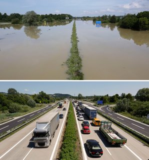 Una foto combinada muestra la autopista A3 inundada (arriba) cerca de la oriental ciudad bávara de Deggendorf y la misma zona de la autopista A3 con un atasco de tráfico causado por daños por calor al superficie de la carretera un