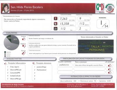 La senadora por Coahuila, Hilda Flores Escalera, ocupa el primer lugar entre todos los 54 senadores priistas por su desempeño en las redes sociales Twitter y Facebook, de acuerdo a un reporte que elabora el Grupo Parlamentario de ese partido en el senado.De acuerdo a éste análisis elaborado por la Coordinación de Redes Sociales del GP -PRI respecto a la actividad que tienen los 54 senadores, Flores Escalera ocupa el primer lugar con 7,236 seguidores en Facebook (Likes), 15,358 seguidores en Twitter, y 112 visitas a su canal de YouTube.