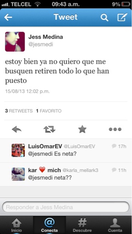 CIUDAD DE MÉXICO, 16 de agosto.- “Estoy bien ya no quiero que me busquen retiren lo que han puesto”, apareció escrito la noche de ayer en la cuenta de Jessica Karen Medina Valadez, de 16 años, quien permanece desaparecida desde el pasado 13 de agosto.Más que una petición, parece una orden, pues “ella no sería capaz de escribir algo así y mucho menos de irse sin así sin dar una explicación”, asegura para Excélsior uno de los familiares.La joven de 16 años desapareció el pasado 13 de agosto Desde muy temprana hora, a través de la cuenta @yohaliresendiz, se difundió la imagen de Jessica Karen, solicitando el apoyo de la ciudadanía para dar con su ubicación.La última vez que supieron de ella, el reloj marcaba las 13:40 horas, y según los datos recabados, ella retiró seis mil pesos de una cuenta de banco y nadie la volvió a ver.Jessica Karen llevaba una sudadera azul marino marca GAP, misma que en la espalda trae la leyenda Londres. Mide 1.63 metros, tiene piel blanca, cejas pobladas y labios gruesos. Su cabello es castaño oscuro y utiliza brakets.Karen llevaba consigo a Cora, una perrita Frech Puddle blanca, que el día de hoy fue entregada al domicilio de la joven por dos personas.Sucedió así. Una vez desaprecida Jessica, y con el volante deCAPEA en las manos, sus familiares se dedicaron a colocar en postes y paredes de varias colonias la imagen de la joven con su perrita, que apareció deambulando por la calle de Córdoba, en la colonia Roma.Quienes recuperaron a la mascota, al verla en los carteles, se comunicaron con la madre de Jessica, quien les confirmó su pertenencia, y poco después le fue entregada. De Jessica, nada. Hasta esta madrugada; alrededor de las dos de la mañana, apareció otro mensaje por la cuenta de Twitter de Jessica, que, de acuerdo con su madre, ella no podría estar enviado, lo que hace suponer que alguien ajeno a ella controla su cuenta.Si usted tiene información de Karen, o vio algo el día de su desaparición, favor de enviar un correo a sebusca@gimm.com.mx
