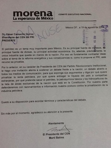 En un oficio entregado al CEN del PRI, Martí Batres, presidente nacional de MORENA invito a debatir sobre la reforma energética a César Camacho (Presidente Nacional de PRI). Hasta el momento no ha habido una respuesta del CEN del PRI.