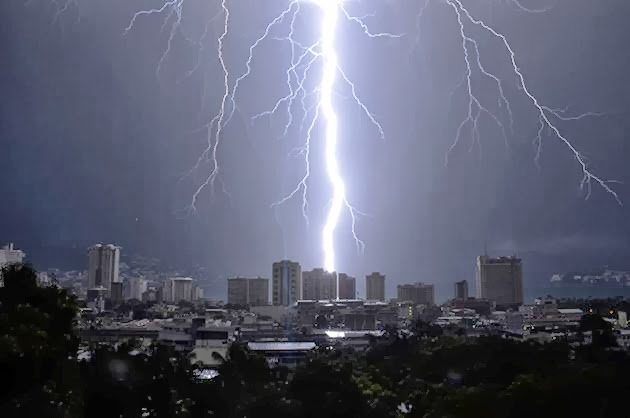 Un impresionante rayo cae en la zona hotelera de Acapulco, Guerrero, México, en anuncio de una próxima tormenta el lunes, 07 de octubre de 2013. El puerto y sus accesos se vienen recuperando después de que la tormenta tropical Manuel dejará miles de damnificados. La Autopista del Sol apenas fue reabierta en su totalidad y será gratuita hasta el 15 de octubre.