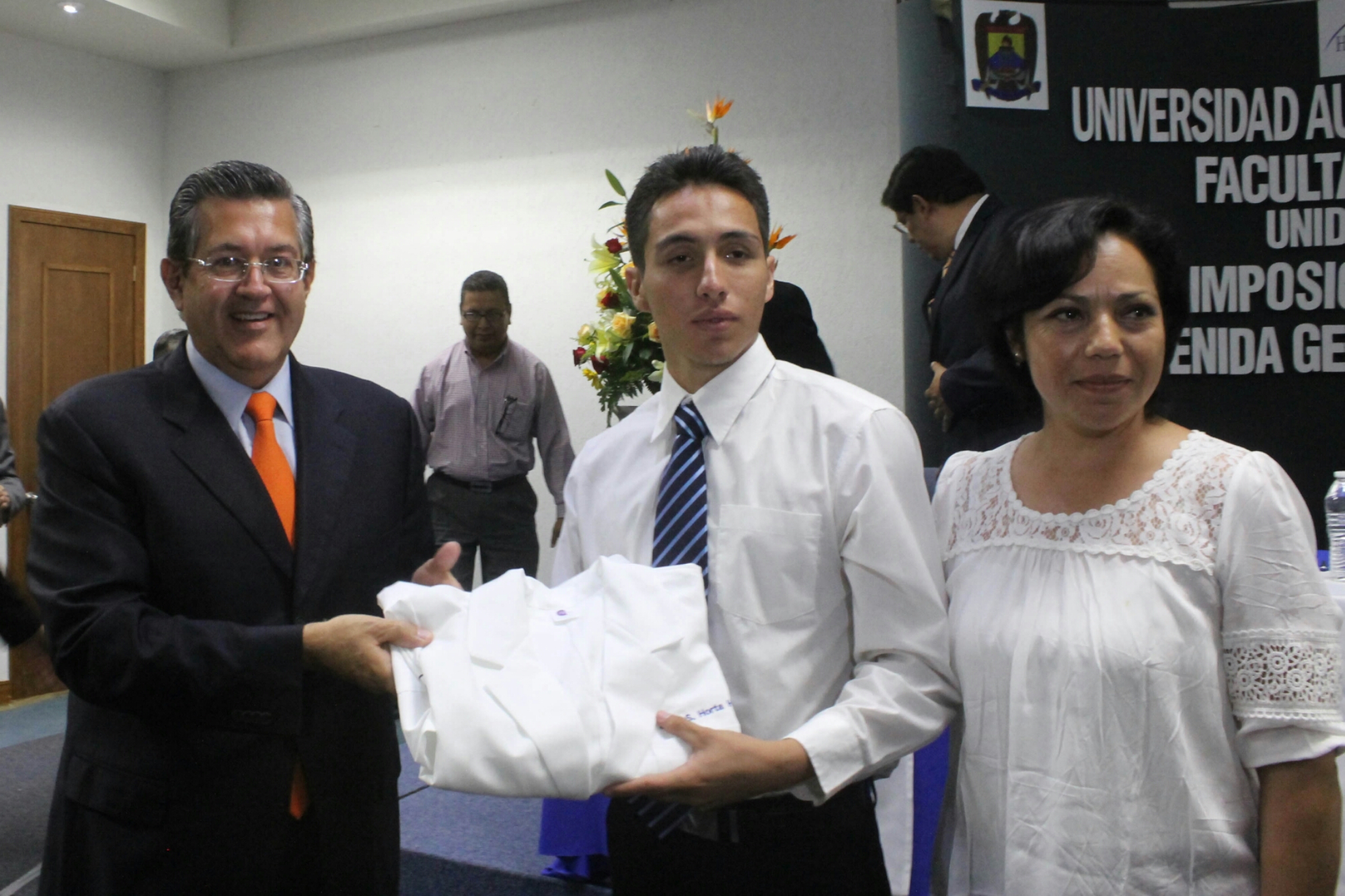 Al haber obtenido el puntaje más alto con 145.7 puntos en el examen de admisión, José Salomón Orta Hernández, recibió de manos del rector Blas Flores la bata blanca que le fue impuesta por su madre.