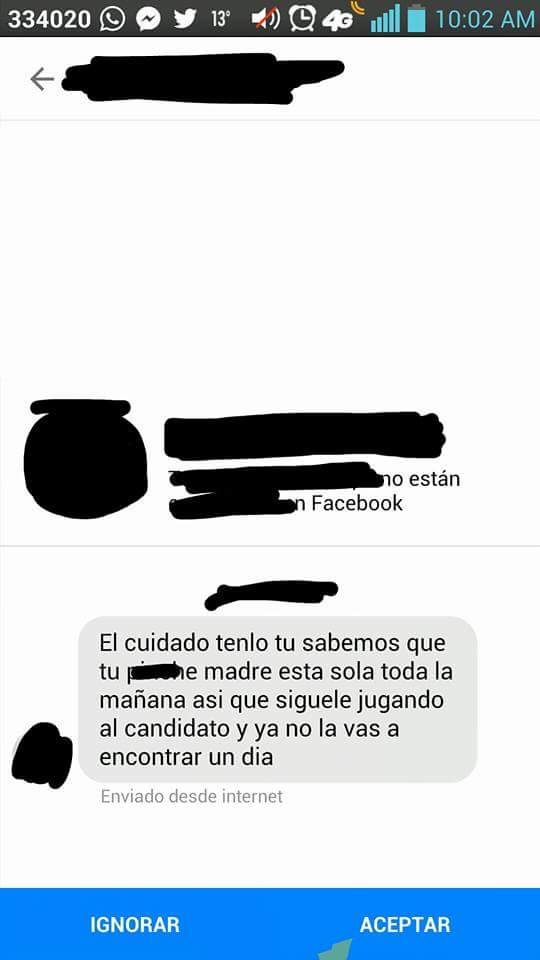 A través de un mensaje privado por la red social Facebook, Noe Gomez; aspirante a la candidatura de la presidencia municipal por la vía independiente, recibió amenazas de una cuenta que omiten su nombre debido a que se sigue una investigación cibernetica.