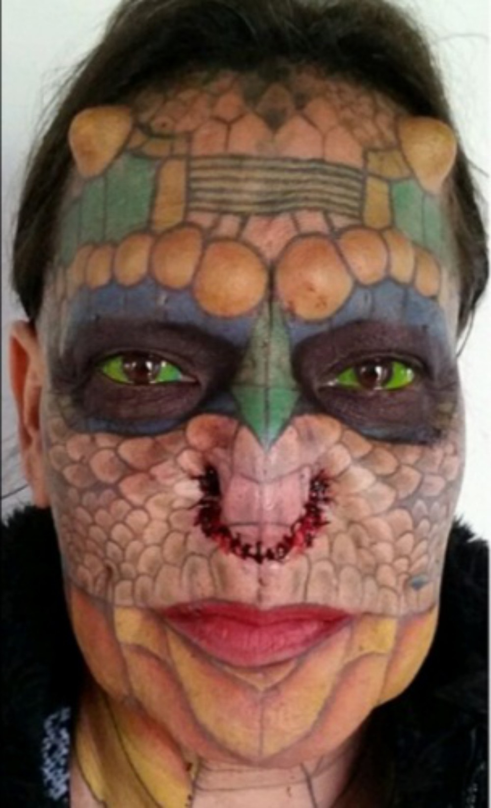 Para ello, Eva se ha quitado las orejas, se ha tatuado escamas, se ha separado la lengua para convertirla en bífida, se ha tintado los ojos, se ha raspado la nariz hasta dejarla prácticamente en un pequeño bulto y se ha implantado unas pequeñas protuberancias a modo de cuernos en la frente.