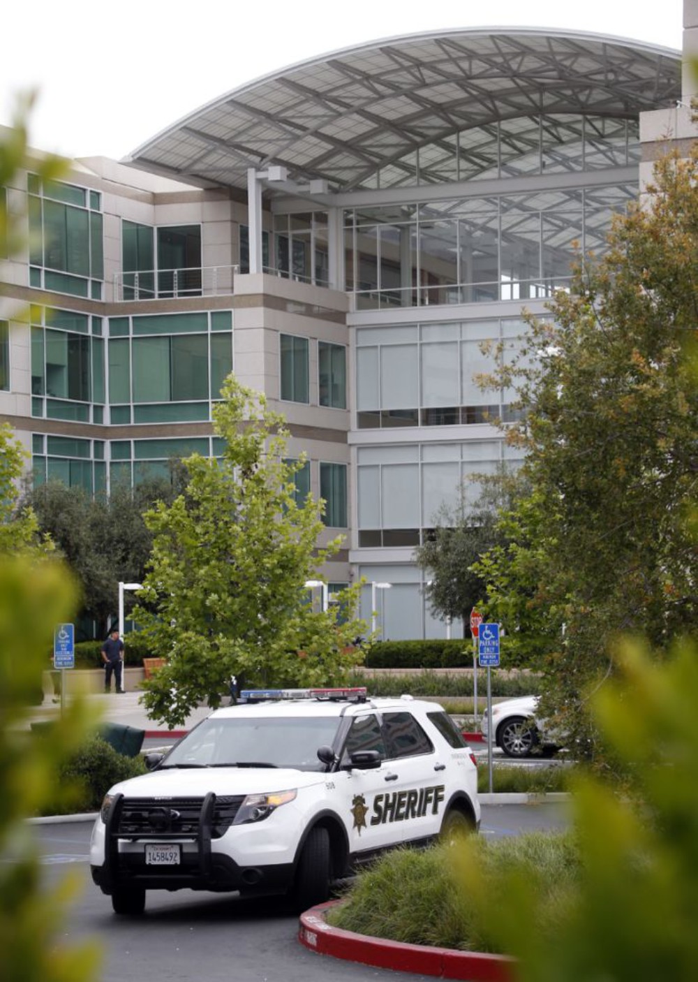 Agentes del jefe de policía del condado Santa Clara investigan un informe sobre un cadáver hallado en la sede de Apple, el miércoles 27 de abril de 2016, en Cupertino, California. (Karl Mondon/Bay Area News Group vía AP) NO PUBLICAR EN REVISTAS; NO VENTAS; CRÉDITO OBLIGATORIOMás