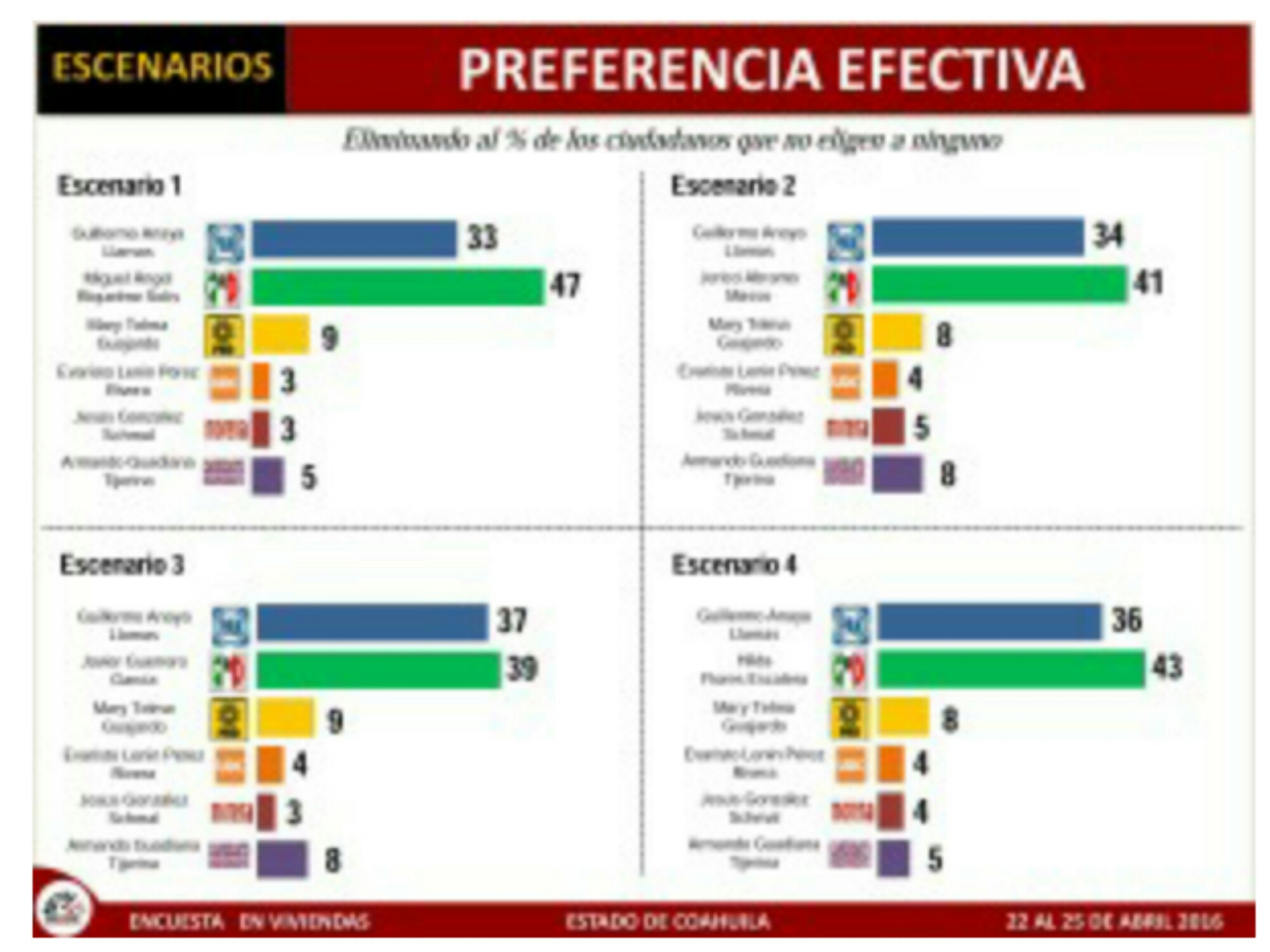 Una encuesta de vivienda realizada a más de mil 200 personas entre el 22 y el 25 de abril en Coahuila; realizada por Consulta Mitofsky casa encuestadora de prestigio, coloca a Miguel Ángel Riquelme del PRI y Guillermo Anaya del PAN, como los competidores naturales rumbo a la gubernatura en las elecciones de 2017.