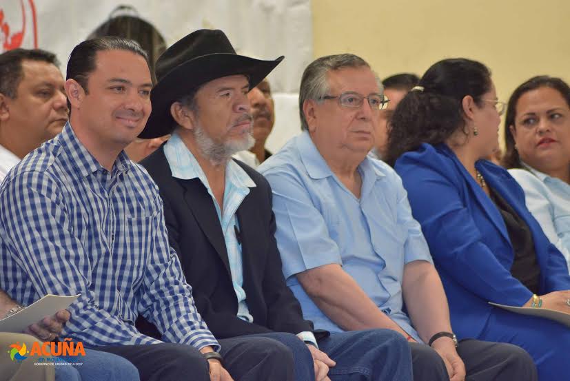 Acuña, Coah., A las 11:40 horas fue inaugurado en Acuña el XXI Consejo Agrario Estatal, al que asistieron dirigentes de organizaciones campesinas existentes en Coahuila, que presidió en Primer Regidor Emilio de Hoyos Montemayor, en representación del Alcalde Evaristo Lenin Pérez Rivera, así como el Secretario del Ayuntamiento Héctor Arocha Gómez.