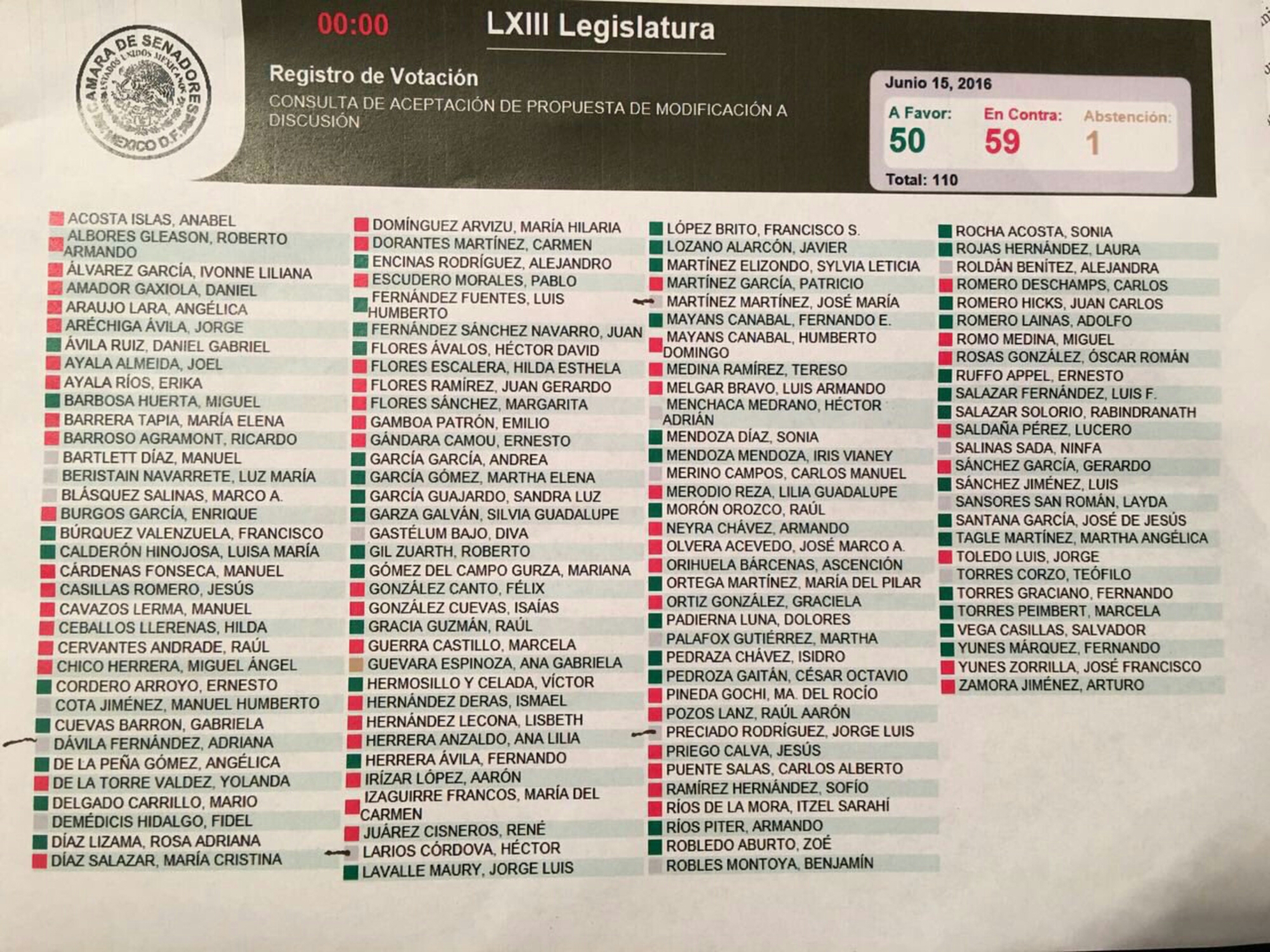 (Por redacción).- 15 de Junio del 2016. Los Senadores Tereso Medina e Hilda Flores Escalera, del grupo parlamentario de PRI, votaron en contra de la iniciativa ANTICORRUPCIÓN «3 de 3».