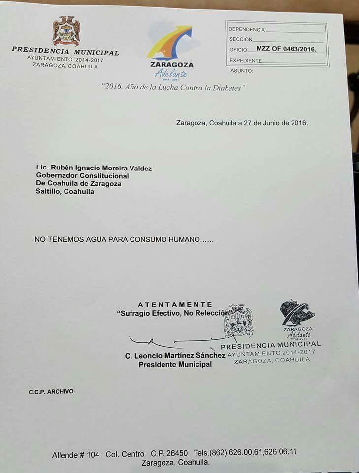 El C. Leoncio Martínez Sánchez presidente municipal de Zaragoza, Coahuila. Envío un oficio al Gobernador Rubén Moreira en una breve frase. «NO TENEMOS AGUA PARA CONSUMO HUMANDO».
