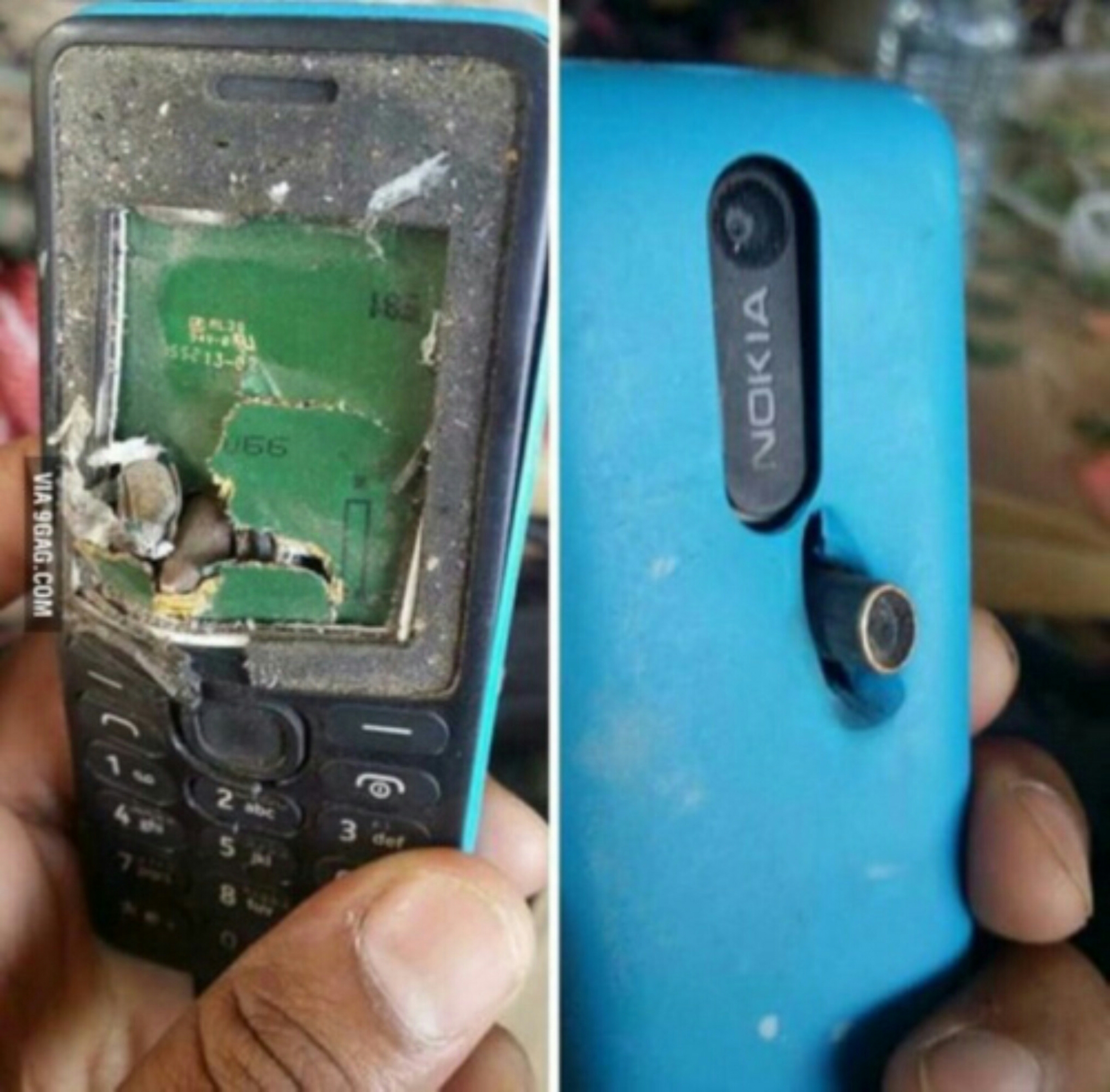 Peter Skillman, quien trabajó en el equipo que creó el teléfono a prueba de balas y ahora es director general de una división de Microsoft, publicó en Twitter una foto de un viejo Nokia atravesado por una bala.