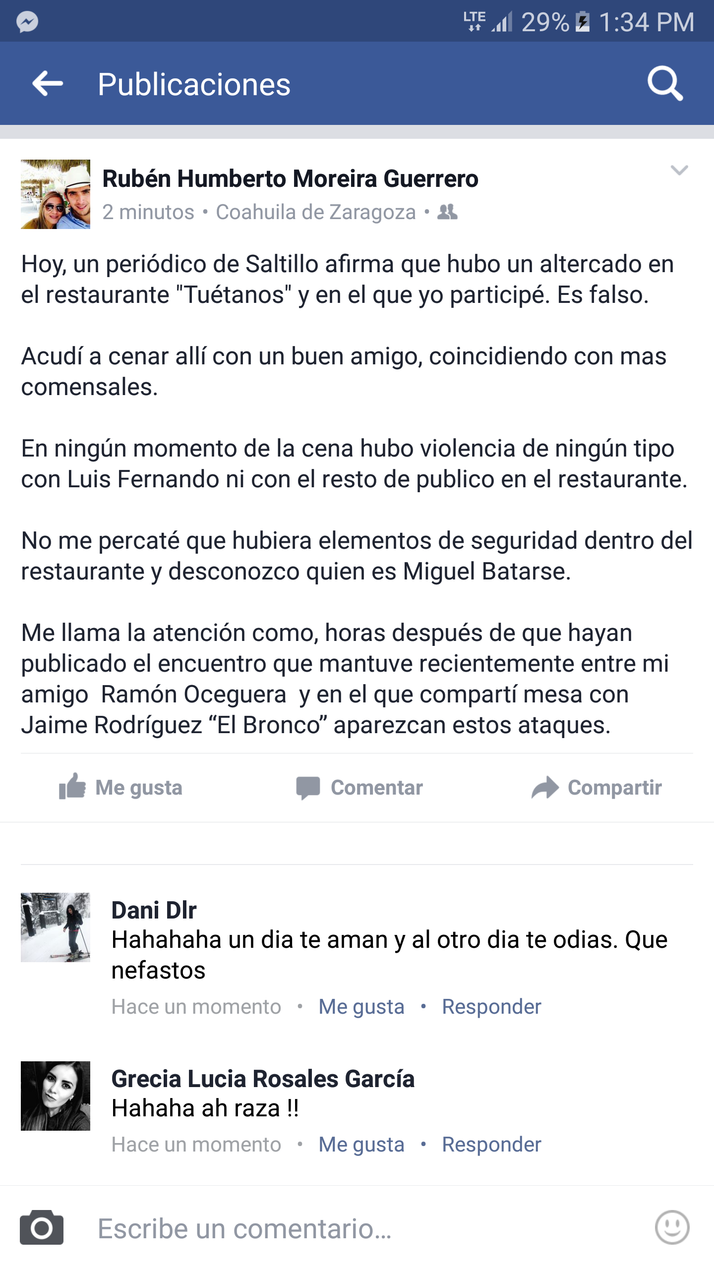 En sus redes sociales, Ruben Humberto Moreira; hijo de Humberto moreira. Nego haber participado en un conato de bronca con el Senador con licencia Luis Fernando Salazar y además; hace conocer sus «conjeturas» que dicho ataque es por compartir mesa con «El bronco» gobernador de Nuevo Leon.