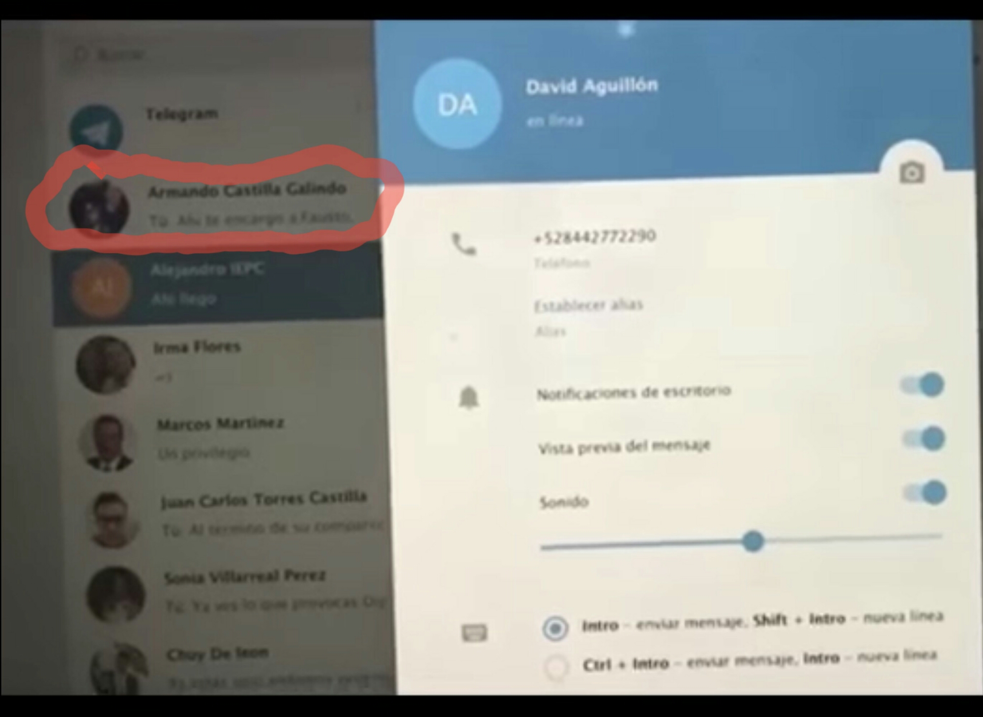 En una capturade pantalla de un «hakeo» al teléfono celular de David Aguillón Rosales, se muestran varias conversaciones con diferentes actores políticos.