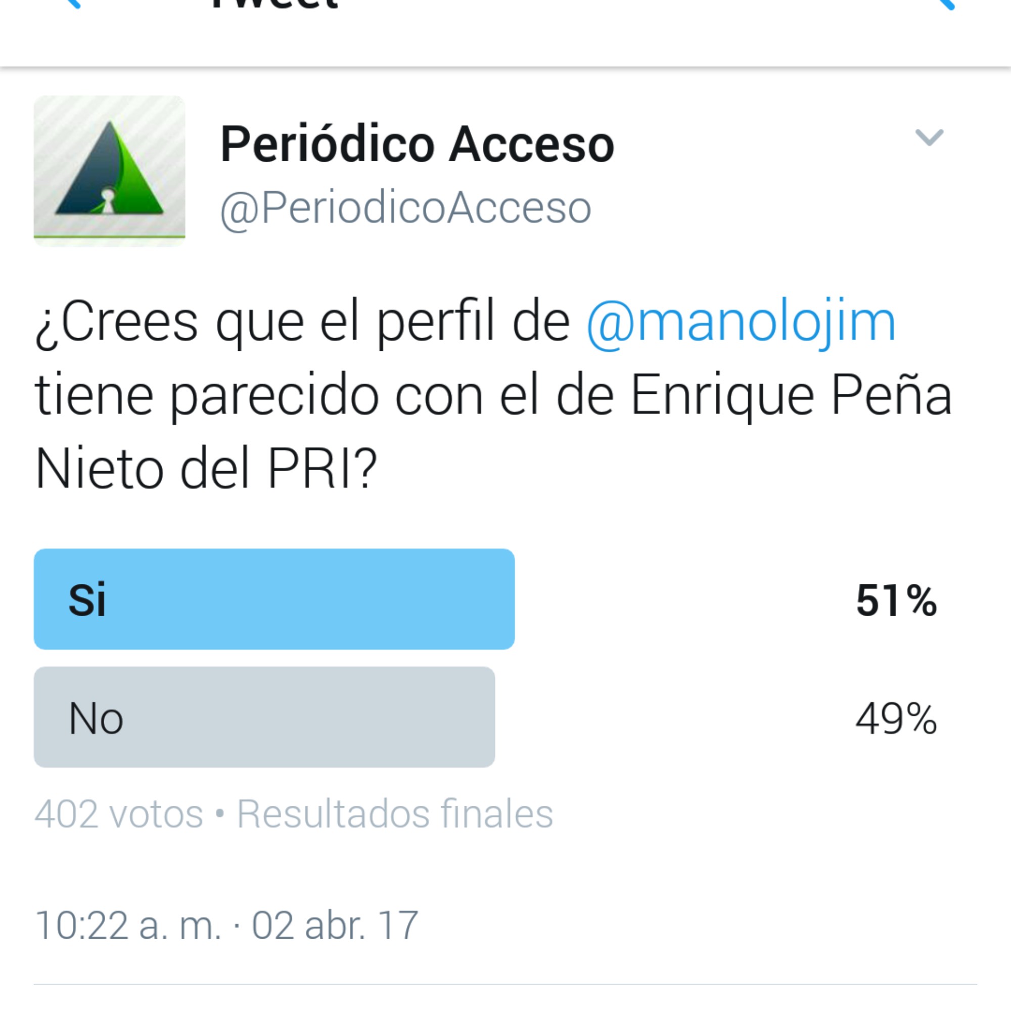 En una encuesta realizada en Twitter, reveló que el candidato de PRI a la alcaldía de Saltillo Manolo Jiménez, es considerado similar al Presidente Enrique Peña Nieto.