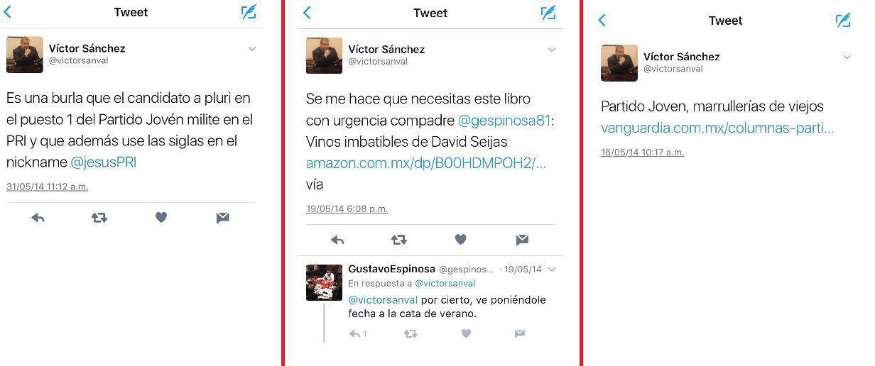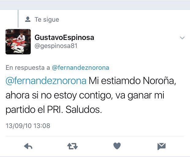 Periódico Acceso público los tweet´s que aparecen dentro de la cuenta pública y oficial del consejero @gespinosa81; en el que en una discusión con el político Gerardo Fernández Noroña dentro de su cuenta @fernandeznorona el consejero Espinosa le aclara: “Mi estimado Noroña, ahora si no estoy contigo, va a ganar mi partido el PRI. Saludos.”