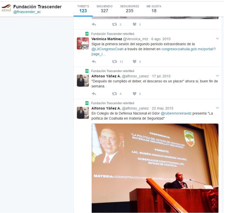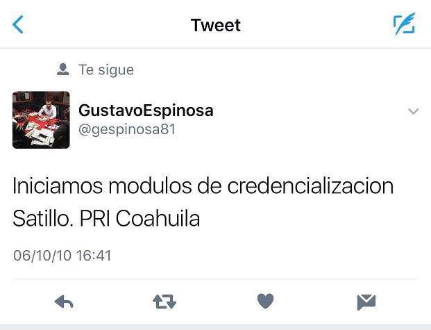 Entre otra cantidad de Tweet´s donde se comprueba su afiliación y apoyo moral al PRI, resalta otro: “Iniciamos módulos de credencialización Saltillo. PRI Coahuila.” En el que es claro y comprometido su trabajo partidista.