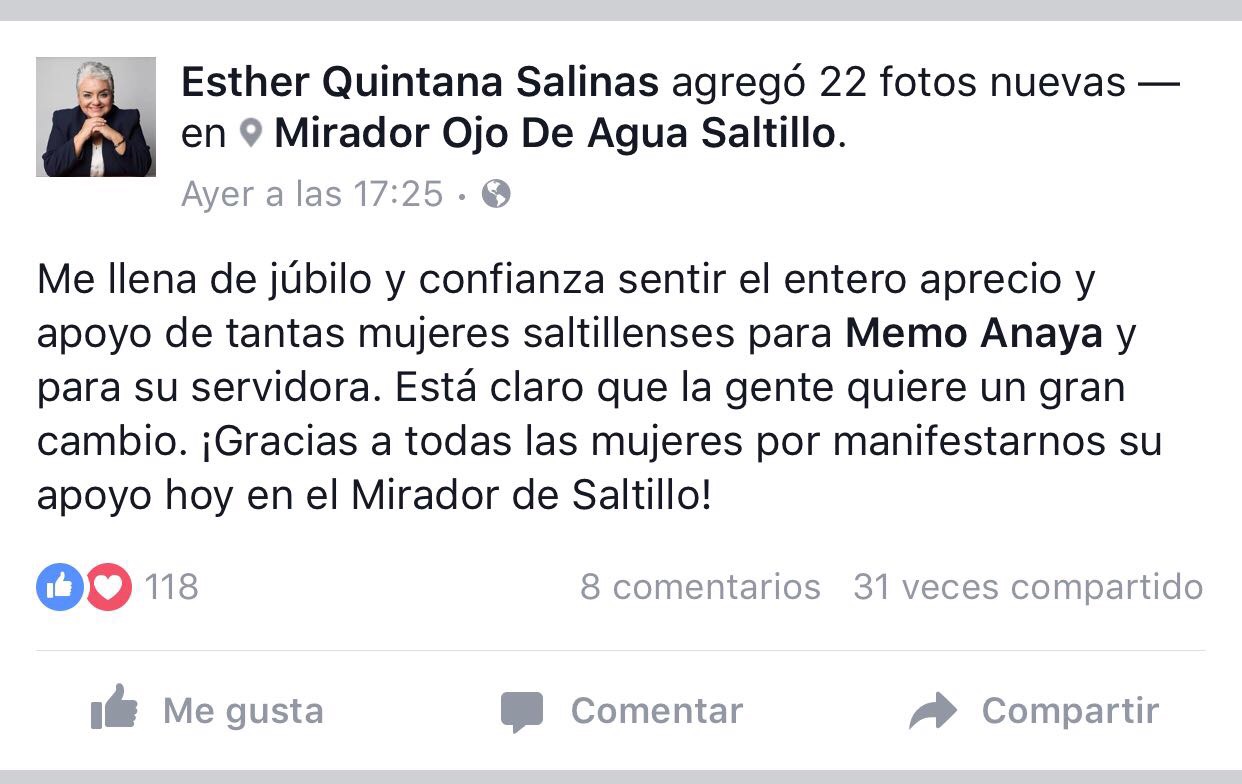 Quintana publicó en sus redes sociales: Me llena de Júbilo y confianza sentir el entero aprecio y apoyo de tantas mujeres saltillenses…