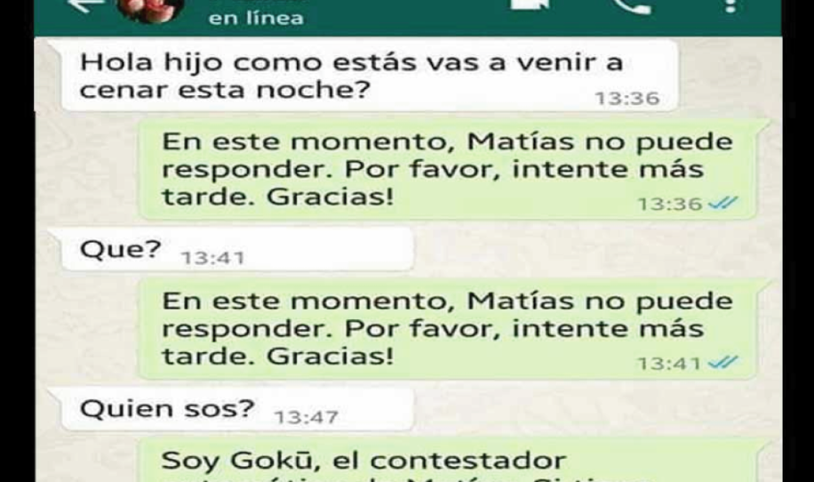 “Soy Gokü, el contestador automático de Matías. Si tiene algo importante que comunicar, escriba Ok seguido de su mensaje y lo guardaré. La conversación, será eliminada en 30 segundos”, es el mensaje que Matías envió a su madre y que dio pie a la broma que hoy hace reír a todos.