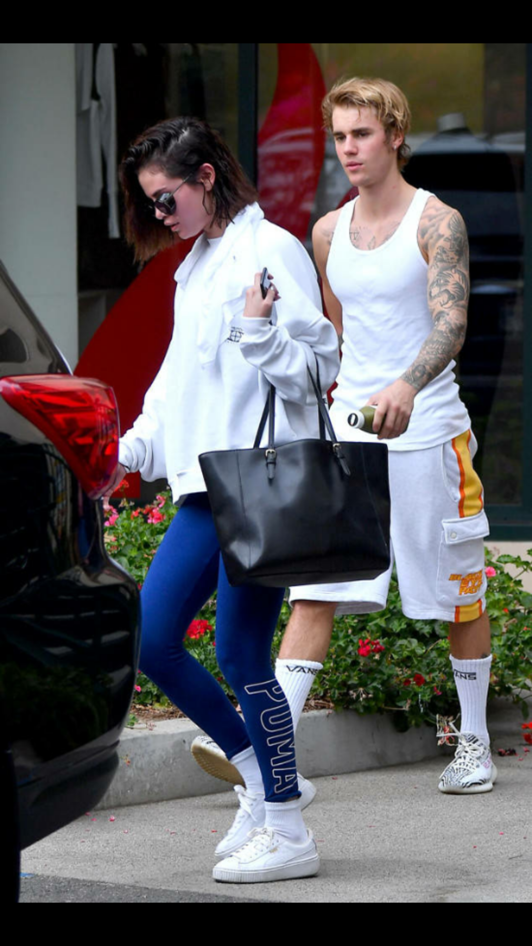 En la imagen aparece la intérprete de “Fetish” con pants azules de Puma, hoodie oversized y tote color negra. Justin Bieber usó un conjunto de ropa deportiva color blanco.