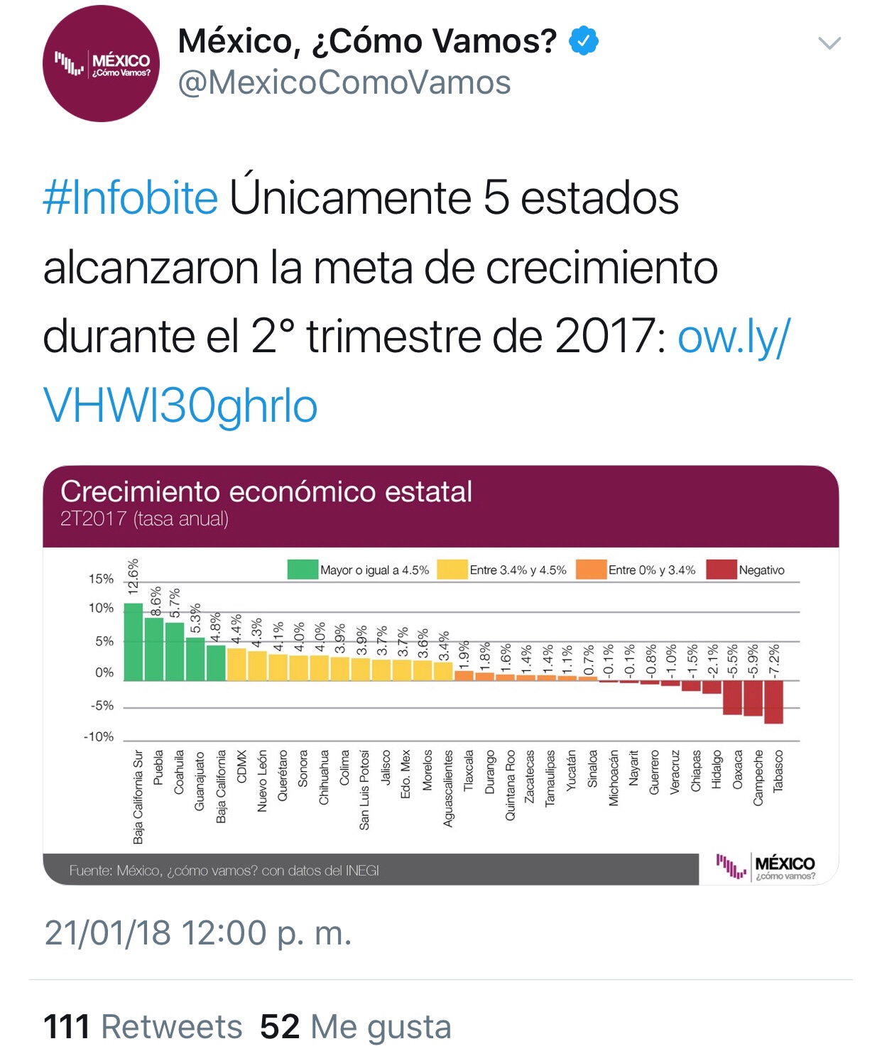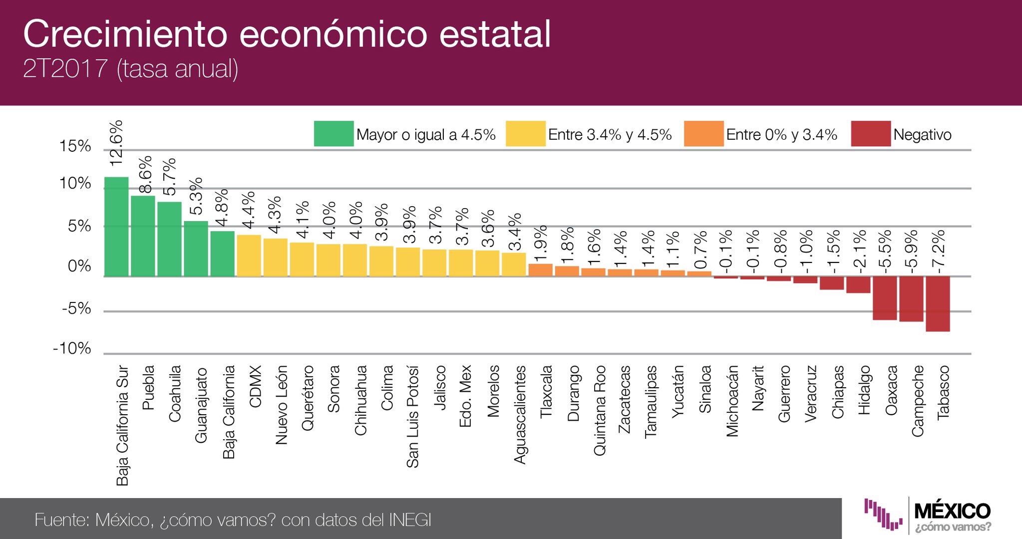 A través de su cuenta oficial de Twitter @MexicoComoVamos dieron a conocer los números de crecimiento de los Estados de la República, donde solamente cinco estados alcanzaron la meta el segundo trimestre del 2017.