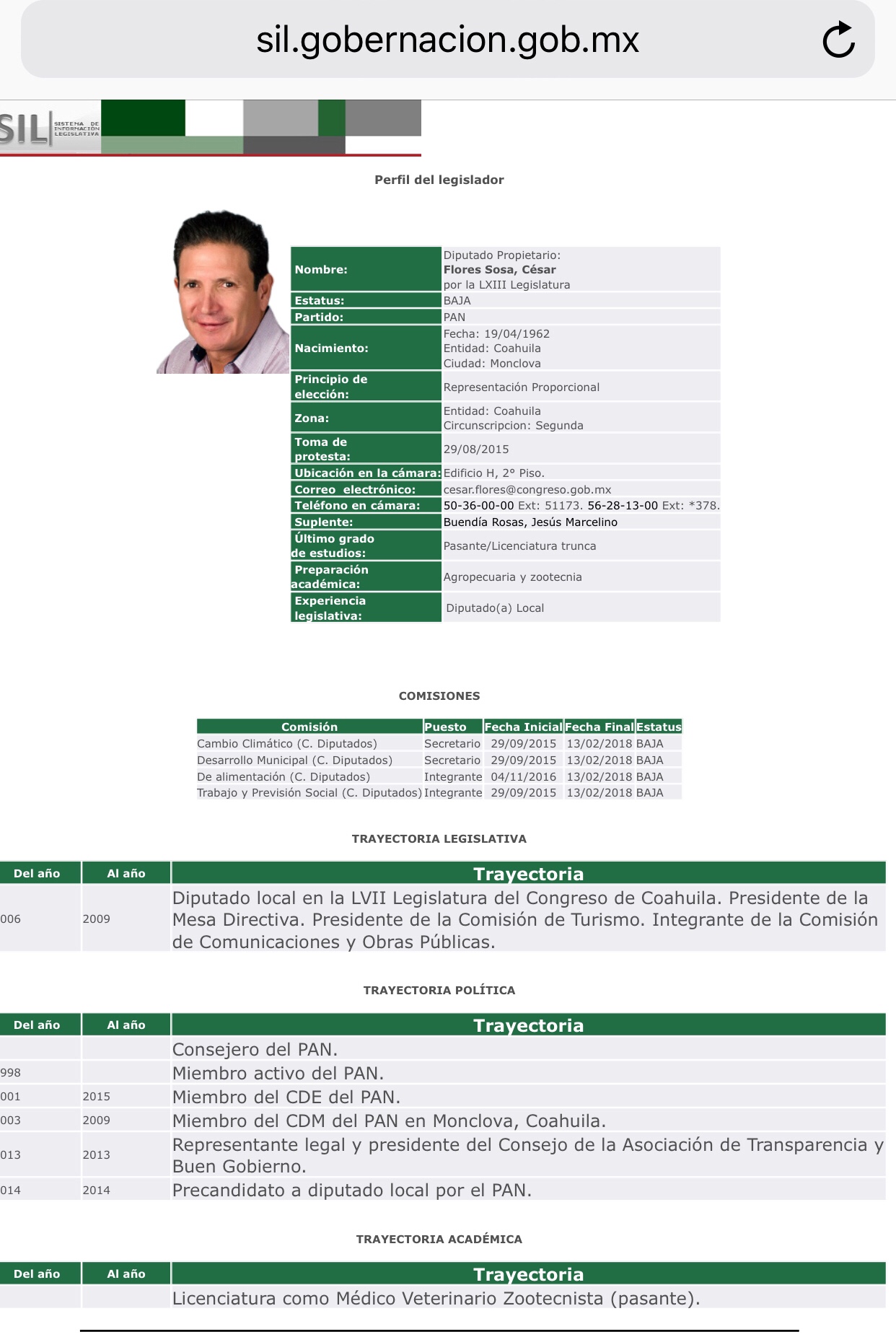 En el sistema de información legislativa sil.gobernacion.gob.mx contiene los perfiles de cada uno de los legisladores. En él, se puede encontrar el perfil del diputado con licencia César Flores Sosa, cercano colaborador a Andres Manuel López Obrador y antes legislador por la fracción del PAN y próximo candidato de MORENA a la alcaldía de Monclova, Coahuila.