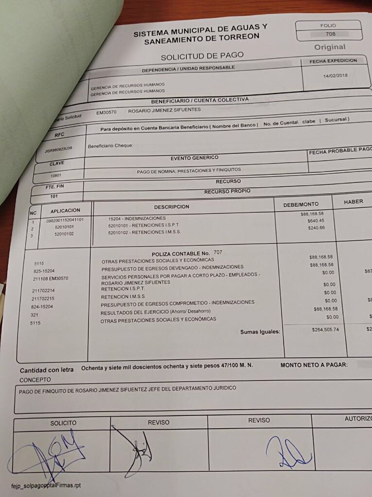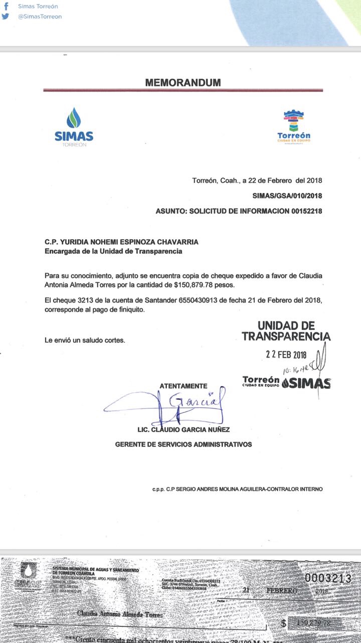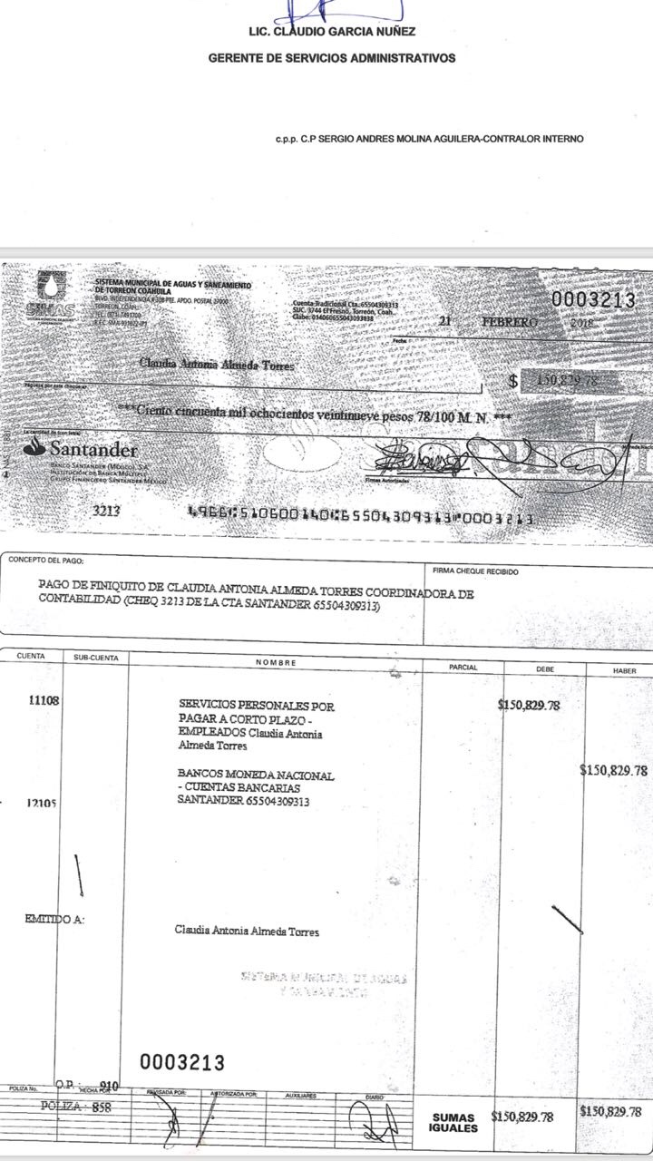 La primera, a Claudia Almeida, coordinadora del departamento de contabilidad del Simas Torreón, la liquidaron con 150 mil pesos y se la llevaron a ocupar la dirección de Egresos de la Presidencia Municipal De Torreón, esta acción es totalmente arbitraria ya que siendo Jorge Zermeño alcalde de Torreón y también presidente del consejo del simas Torreón, debió haberle dado a Claudia un permiso temporal sin goce de sueldo para llevársela a la dirección de egresos ya que es la misma administración, sin embargo debido a que ella es «zermeñista» la liquidan como si la hubieran despedido para beneficiarla con esa liquidación; sin importarle al alcalde dañar las finanzas del sistema operador.