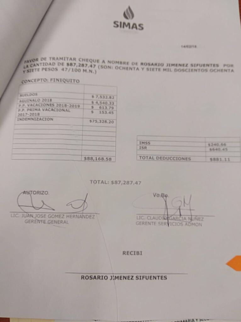 Ella solicitó un permiso sin goce de sueldo por medio de oficio, sin embargo con apenas un mes de estar trabajando en simas (enero), el gerente Juan José Gómez, ordenó tramitarle un cheque por liquidación (como si la hubieran despedido), para darle 87 mil pesos.