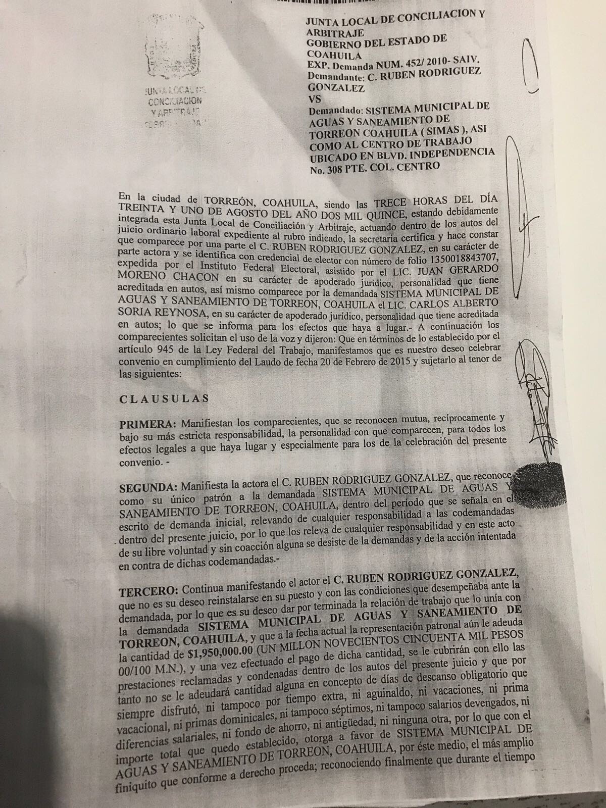 Por otra parte; también está un sujeto llamado Rubén Rodríguez, este personaje ocupo la gerencia de informática en simas Torreón durante la gestión del ex alcalde panista José Ángel Pérez, y al concluir la Administración, demandó a simas Torreón por despido injustificado, cuando esto no debe pasar, ya que es de todos sabido que un puesto de primer nivel llega y se va con los alcaldes en funciones, sin embargo el demandó y ganó el litigio quitándole a simas 2 millones de pesos de liquidación.