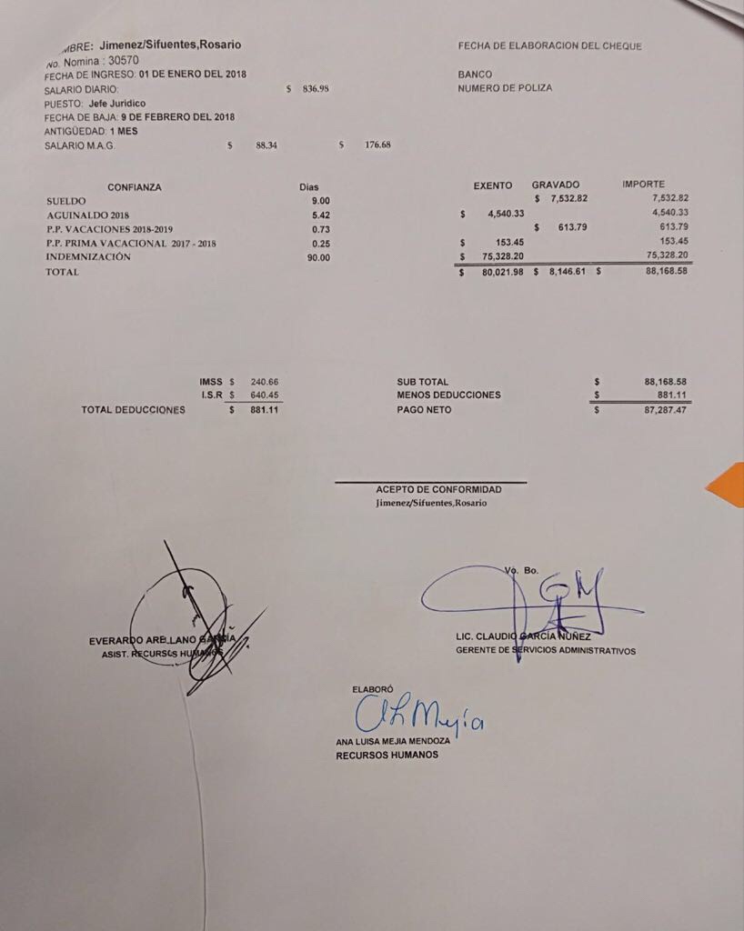 Contrastando con las situaciones de estos 3 casos, hay otro contrario, en el cual una ex trabajadora de la presidencia acudió en la semana para ver su liquidación ya que a ella si la despidieron, sin embargo en el area jurídica del ayuntamiento, le dicen que en base al código municipal los trabajadores de confianza no tienen derecho a liquidación, solo a la baja y ya, esto contrasta totalmente con la forma en que liquidaron a Rosario Jiménez, Claudia Almeida y Rubén Rodríguez pues ellos al igual que la ex trabajadora también eran de confianza, por lo que queda comprobado que solo los consentidos amigos zermeñista se están llenando los bolsillos.