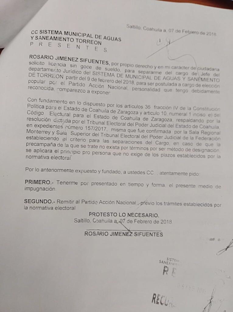 Hace algunas semanas se pretendió liquidar con 87 mil pesos a la directora jurídica del simas Torreón Rosario Jiménez, la cual pidió licencia en simas para ir en busca de una candidatura por el pan a la alcaldía de Saltillo,
