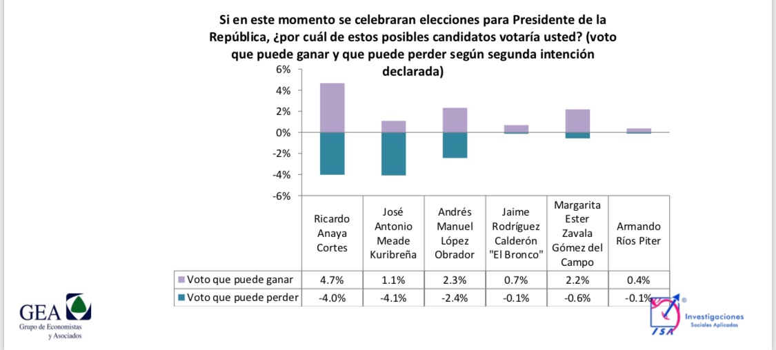 En principio, Ricardo Anaya tiene potencial de crecimiento, ya que del segmento de ciudadanos que dijo que podría modificar su intención de voto (15%), las segundas intenciones de voto lo favorecerían con respecto a López Obrador.