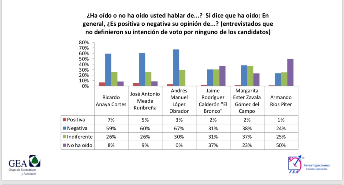 Del segmento de indefinidos, donde podría obtener más intenciones de voto, López Obrador es el candidato con más opiniones negativas.