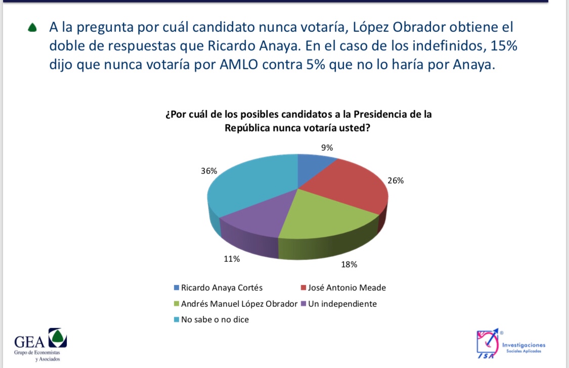 A la pregunta por cuál candidato nunca votaría, López Obrador obtiene el doble de respuestas que Ricardo Anaya. En el caso de los indefinidos, 15% dijo que nunca votaría por AMLO contra 5% que no lo haría por Anaya.