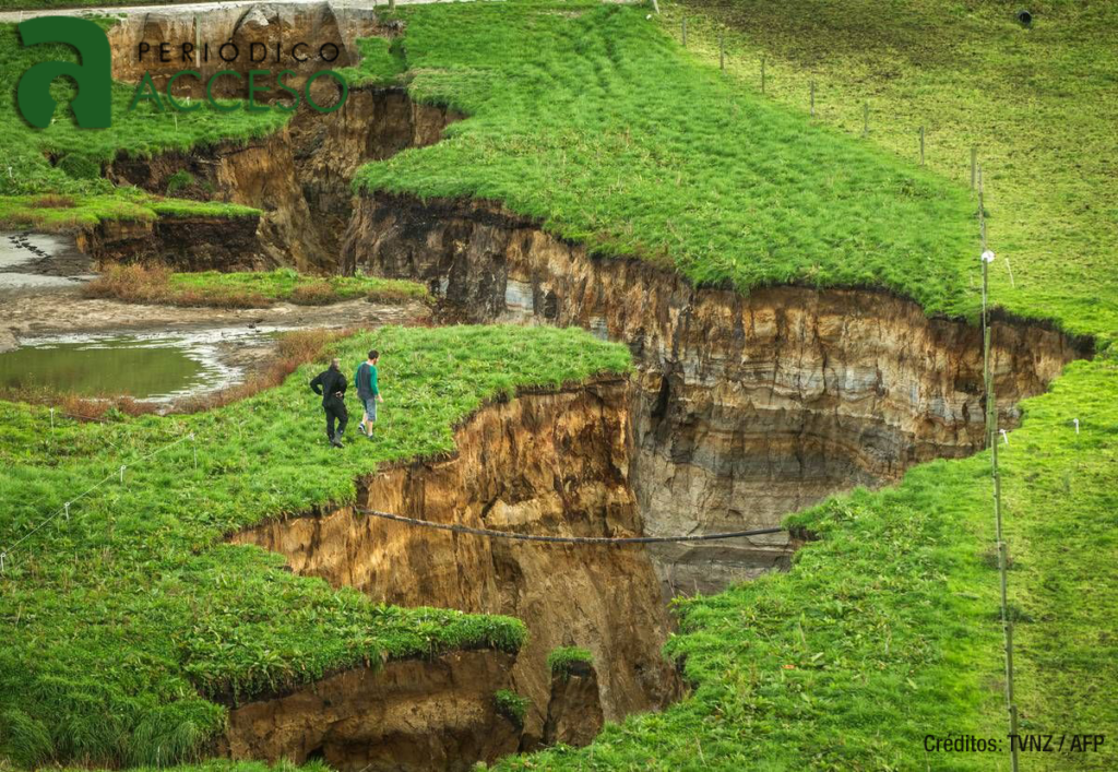 Nueva Zelanda ha sufrido en las últimas semanas fuertes lluvias que causaron importantes inundaciones y dejaron a llegar incluso sin suministro eléctrico a miles de personas en el interior del país. Sin embargo, la consecuencia más sorprendente de este temporal la aparición de la nada de una enorme grieta en una granja de Isla Norte, una de las dos principales de Nueva Zelanda.