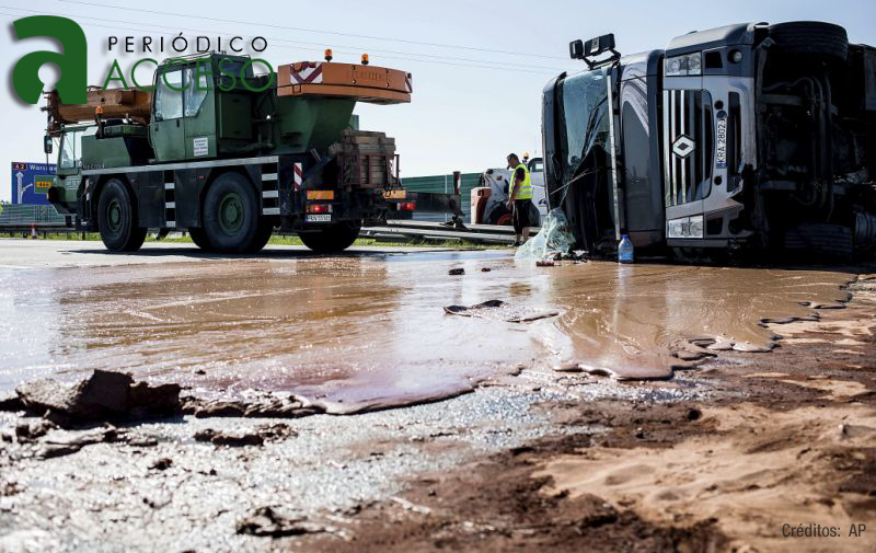 Un tractocamión volcó en una autopista de Polonia y derramó toneladas de chocolate líquido que se convirtió rápidamente en una gran masa pegajosa.
