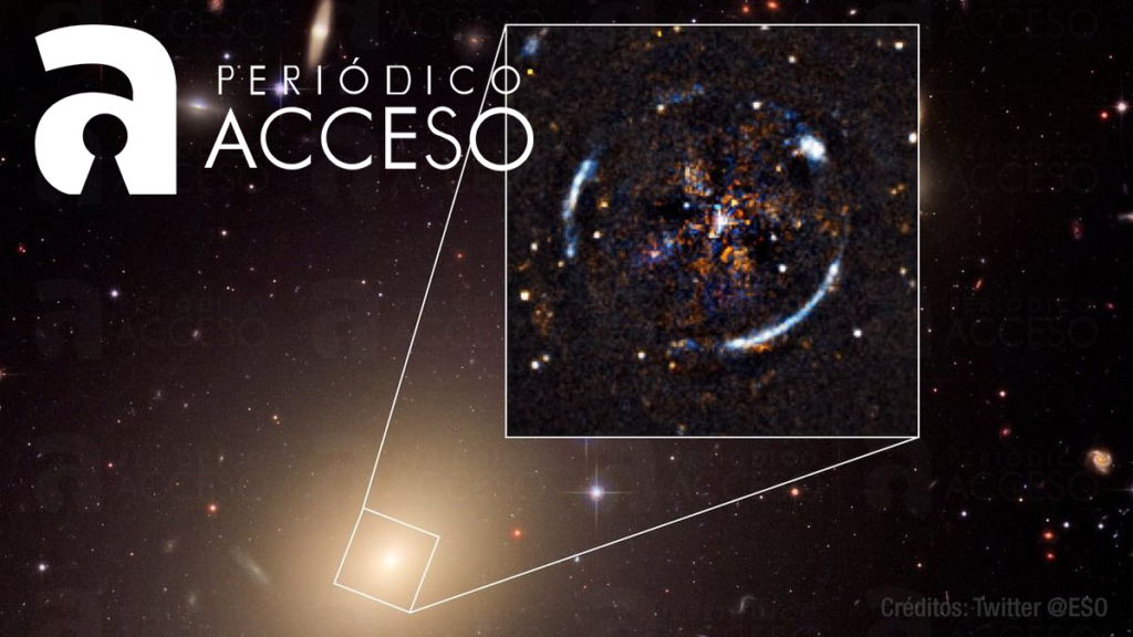 El observatorio explicó que “la cercana galaxia ESO 325-G004 actúa como una fuerte lente gravitacional, distorsionando la luz que proviene de una galaxia lejana que se encuentra detrás de ella y creando un anillo de Einstein alrededor de su centro”.
