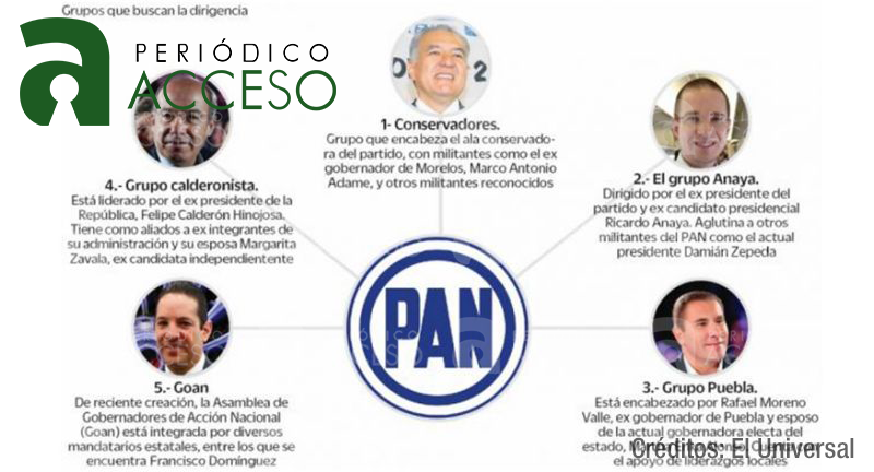 El primer grupo en pugna es el ala conservadora, con casi 80% de militancia e integrado principalmente por ex gobernadores, seguido del bloque de Ricardo Anaya, ex candidato presidencial, respaldado por la mayoría de los dirigentes de comités estatales del país.
