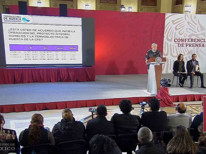 En conferencia, el mandatario explicó que los días sábado y domingo participaron 55 mil 715 ciudadanos en la consulta y de estos, 40.1 por ciento se opusieron a la planta y 59.5 por ciento respaldaron el proyecto.