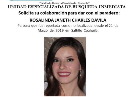 La Unidad Especializada de Busqueda Inmediata de la Fiscalía General del Estado de Coahuila, emitió una ficha por la desaparición de la joven Rosalinda Janeth Charles Dávila, de 20 años de edad, quien fue reportada por sus padres en el municipio de Saltillo.