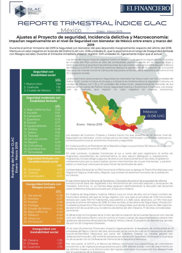 El estado de Coahuila obtuvo el segundo lugar nacional en la medicion del nivel de seguridad con bienestar, de acuerdo con la escala del indice GLAC elaborado por la Security Consulting Technology Risk Management. Con este resultado que califica a nuestro estado dentro del rango de “seguridad con estabilidad social” Coahuila queda ubicado muy por encima de la media nacional que sitúa al pais en el rango de “seguridad limitada con inconformidad social”. Este resultado deriva de los avances de Coahuila en los rubros Politico-Social, Seguridad-Justicia y Economico-Financiero.