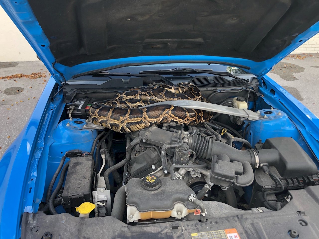 Especialistas de la Comisión de Conservación de la Fauna y la Pesca de Florida (FWC) retiraron de un auto Ford Mustang una serpiente pitón de 10 pies (3 metros) de largo que había encontrado un escondrijo junto al motor.