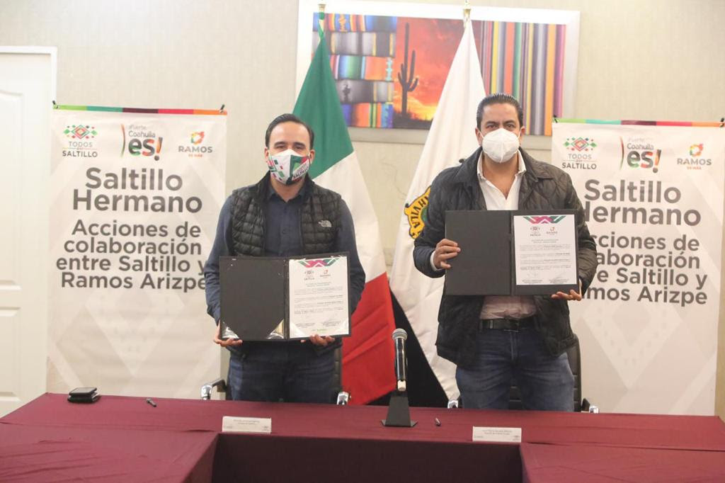 El alcalde Manolo Jiménez Salinas firmó un convenio con su homólogo de Ramos Arizpe, José María Morales Padilla, como parte del programa Saltillo Hermano, a través del cual la capital de Coahuila establece acciones de colaboración con municipios de la entidad con el objetivo de cerrar filas con el Gobernador Miguel Riquelme.
