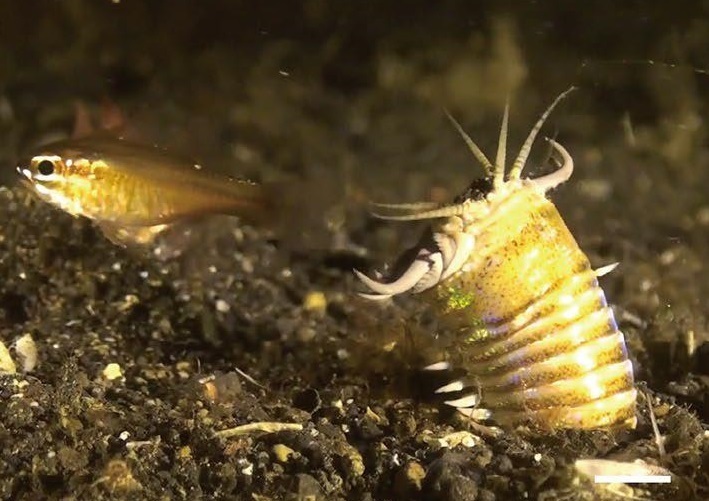 Los gusanos bobbit se esconden en madrigueras largas y estrechas dentro del lecho marino y se impulsan hacia arriba para agarrar presas con sus fuertes mandíbulas.