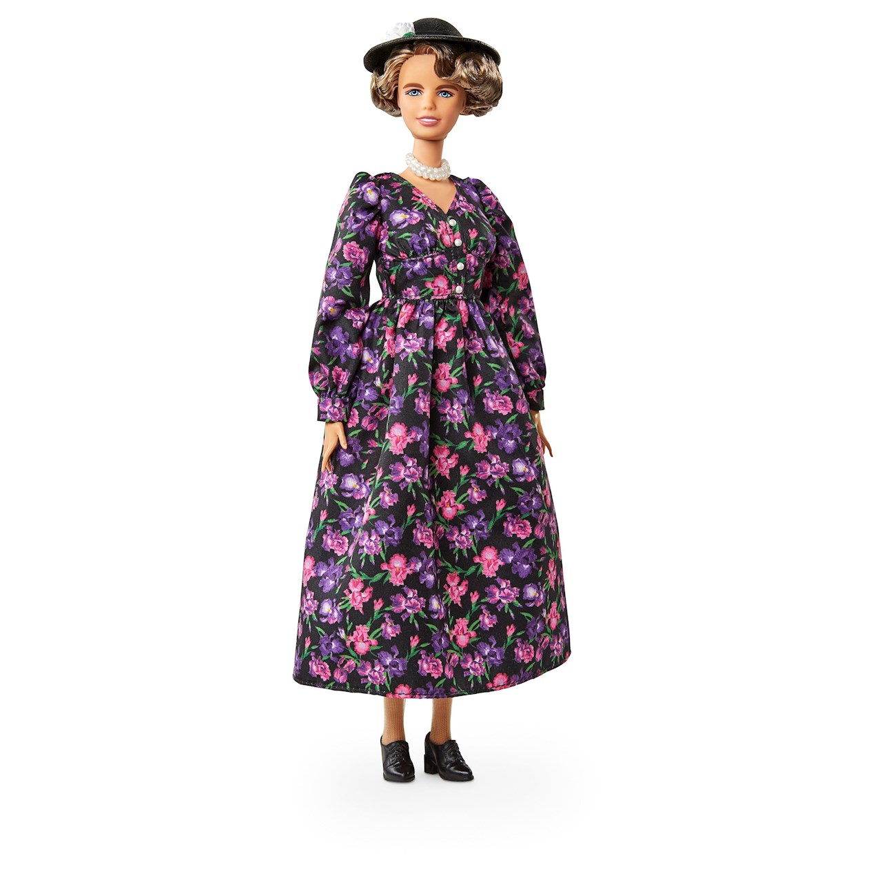 La «Barbie» de Eleanor Roosevelt, a quien el presidente Harry S. Truman llamó «la primera dama del mundo», luce un vestido con estampado floral, sombrero negro y zapatos de cordones del mismo color con un collar de perlas de dos vueltas como único accesorio.