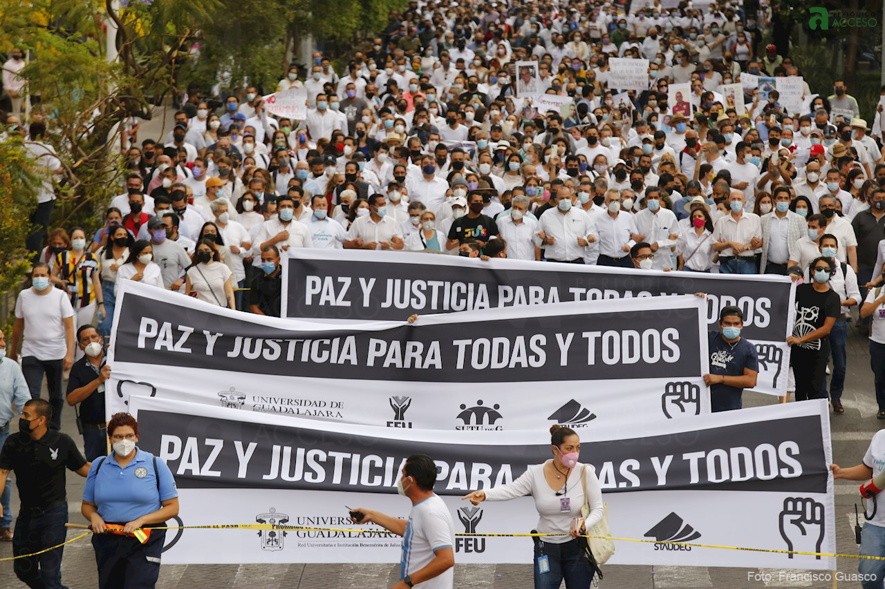 Estudiantes y académicos de la Universidad de Guadalajara (UdeG) salieron a las calles vestidos de blanco y portando velas para pedir que se esclarezca la muerte de los tres jóvenes, que fueron sacados a la fuerza de su casa por un comando armado.